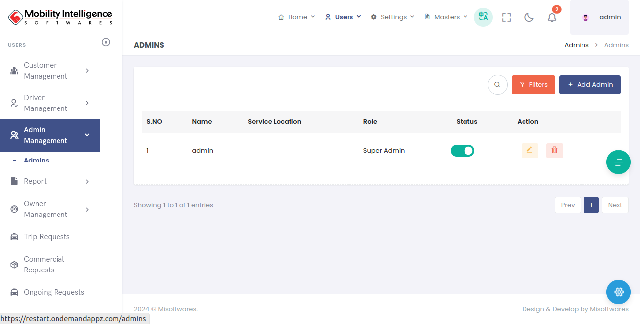 In the Admin Management menu, you can create new admin users and assign them to specific service locations. The super admin has the ability to create new super admin users as well. Each admin user can create additional admin users with varying privileges tailored to their roles within the system.