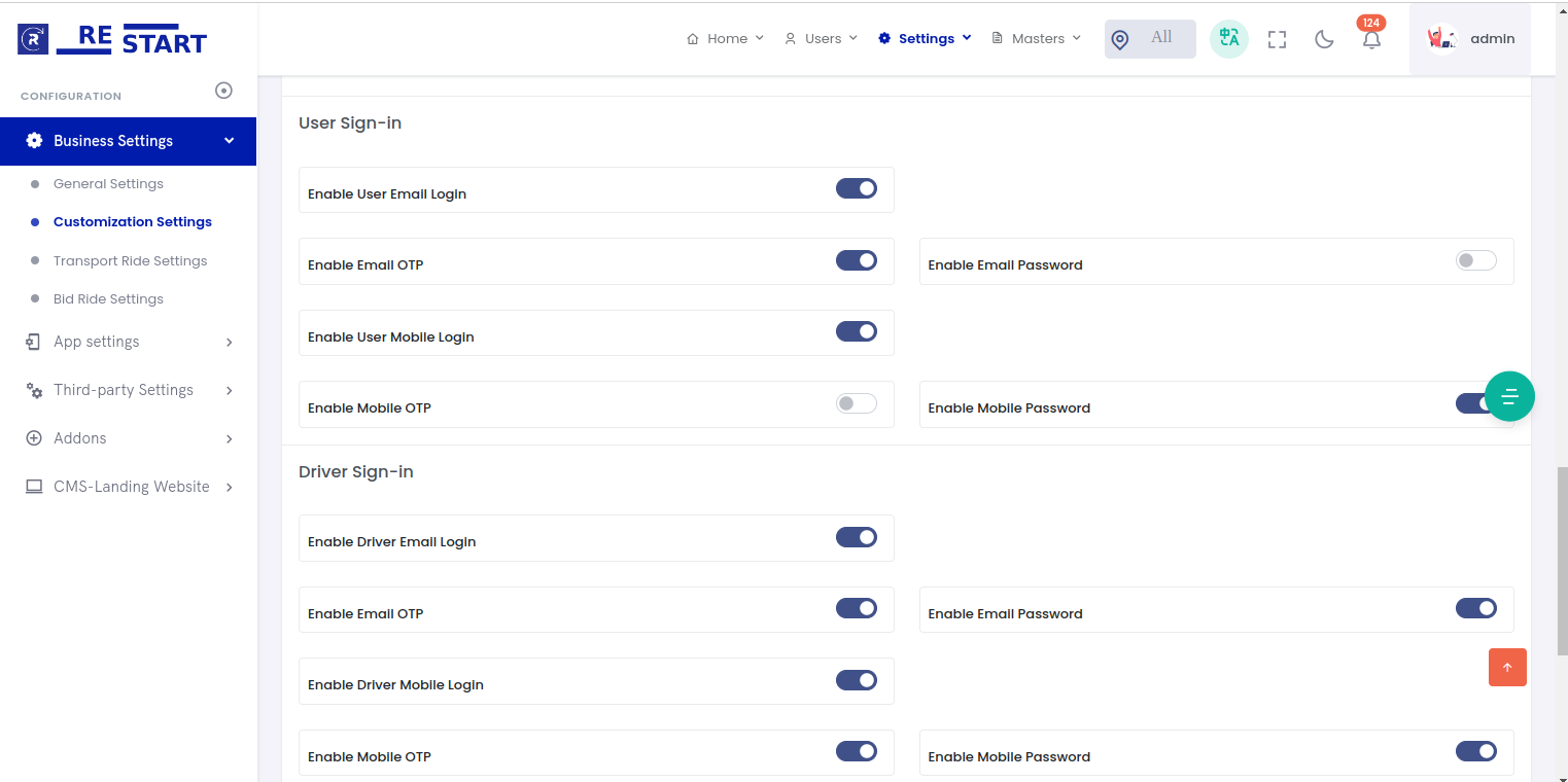 The Authentication Configuration module allows administrators to fully control how users sign in to the taxi application. Using this module, you can enable or disable different authentication methods based on your business requirements or security preferences.