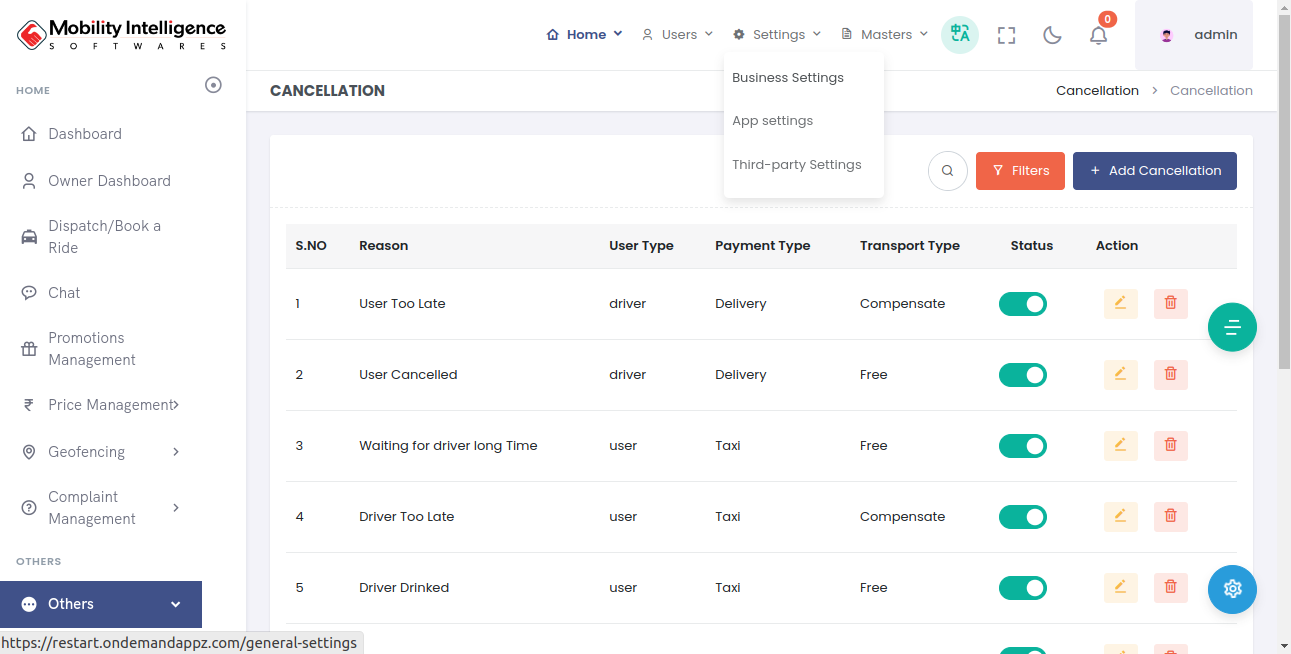 By using cancellation menu admin user can configure the cancellation reasons for both users & drivers with arrival state. And also we can configure whether the reason could be compensate or free. if it is componsate the cancellation fee would be charged for the users & drivers as well.