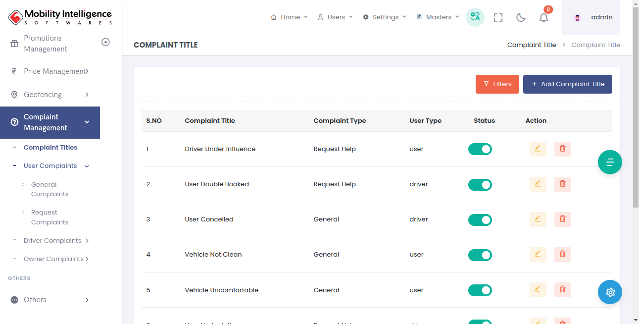 Here you can see the complaints list that is raised by the users & drivers from the mobile application. And we can configure the complaints titles at which category they want to rise thier complaints. Please refer an image below.