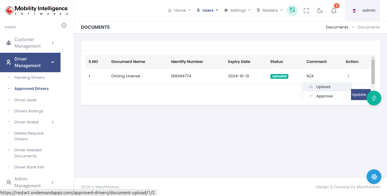 The Driver Management menu displays a comprehensive list of all registered drivers using our application. Admins can edit driver information and delete driver accounts. Additionally, there is a document view option in the drivers list to manage driver documents. Admin users can upload and remove documents for each driver, approve or decline documents, and provide comments during the decline process. These comments will be visible in the mobile approval screen.
