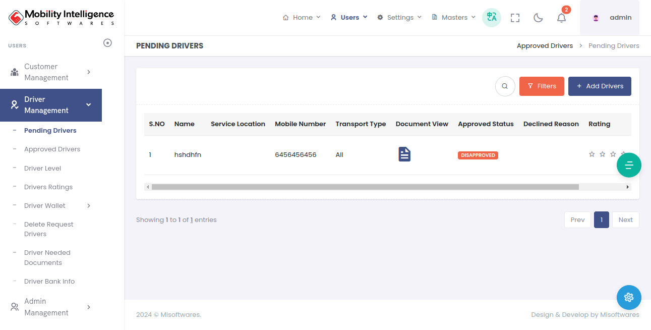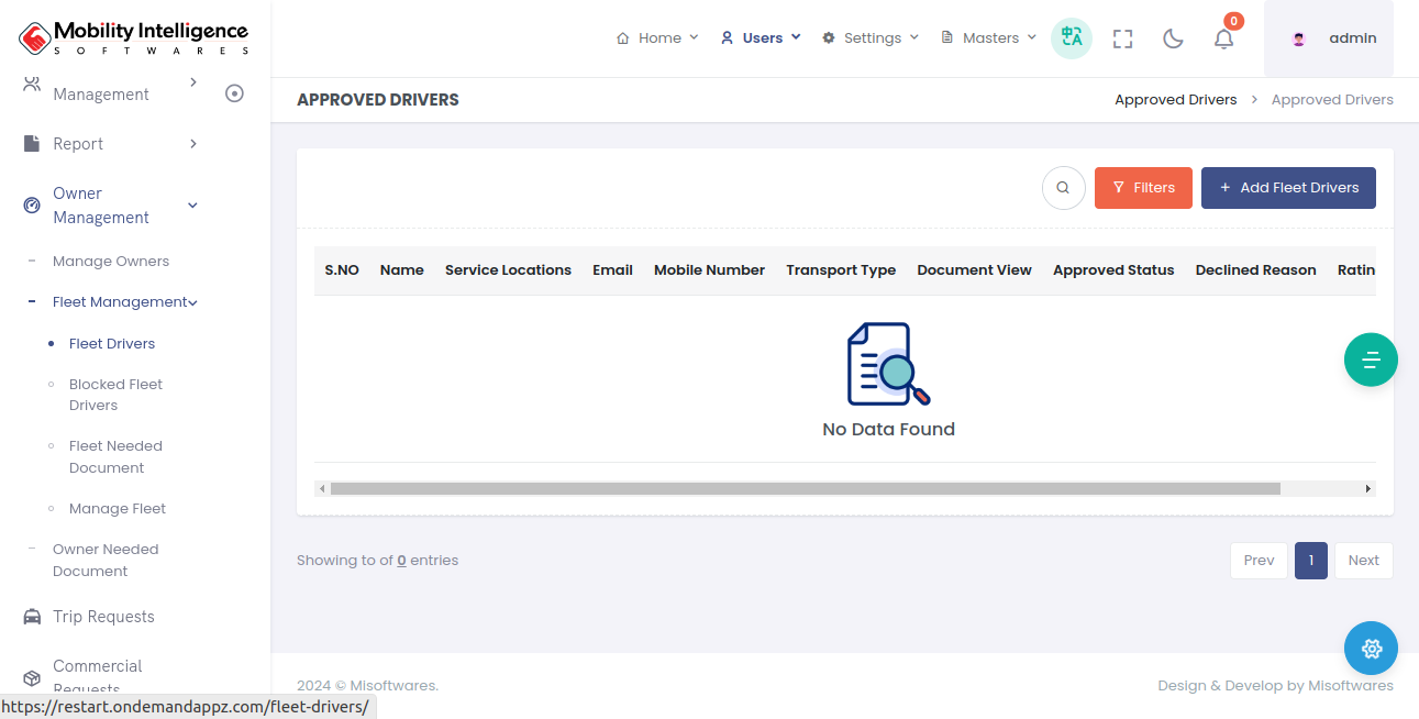 In this submenu, owners can view all drivers associated with their fleet. This section provides insights into driver activities, including approved and declined drivers, along with driver statistics to monitor performance effectively.