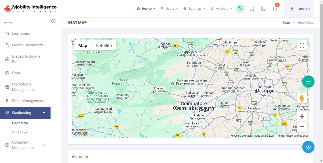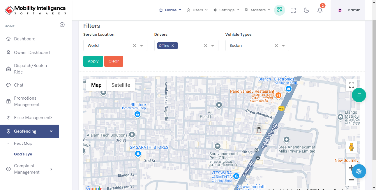 The Geofencing module provides two unique views for monitoring driver availability and ride demand across service areas: "God's Eye" and "Heat Map." These views allow dispatchers and admins to gain real-time insights into driver distribution and areas of high demand, enabling informed pricing adjustments and resource allocation.