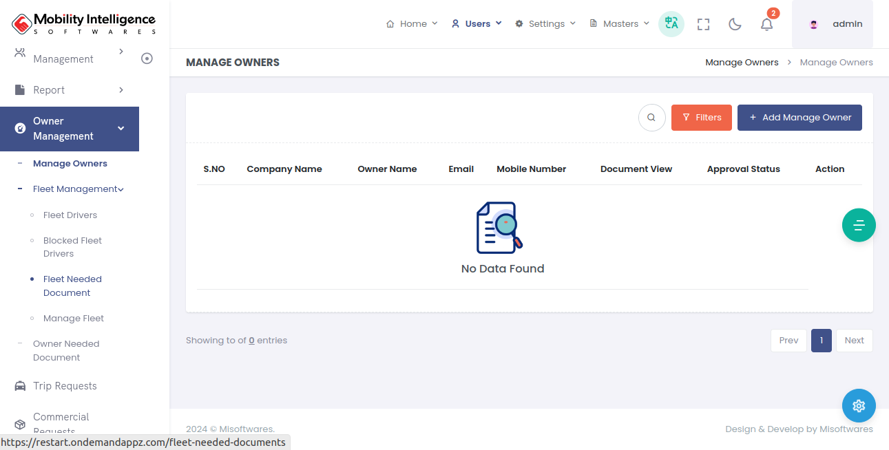The Owner Management section allows you to oversee fleet operations and manage fleet drivers under each owner. This feature is designed to streamline the administration of vehicle fleets and their assigned drivers, ensuring efficient oversight of resources.