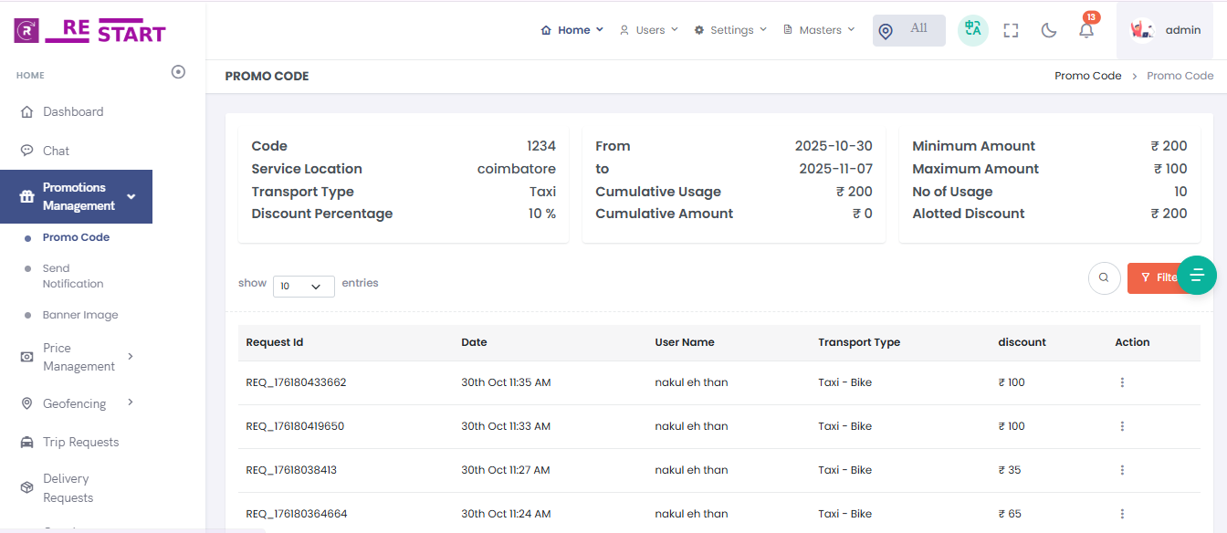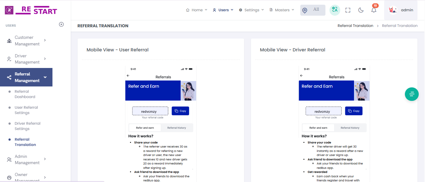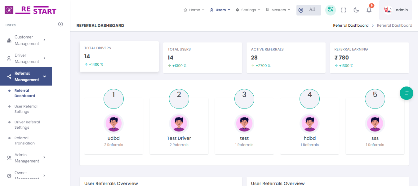 The Referral Dashboard allows users and drivers to view, track, and manage referral-related activities. This includes referral codes, earned rewards, referral history, and performance insights. The dashboard provides how many users and drivers were successfully referred and the rewards earned from each referral.