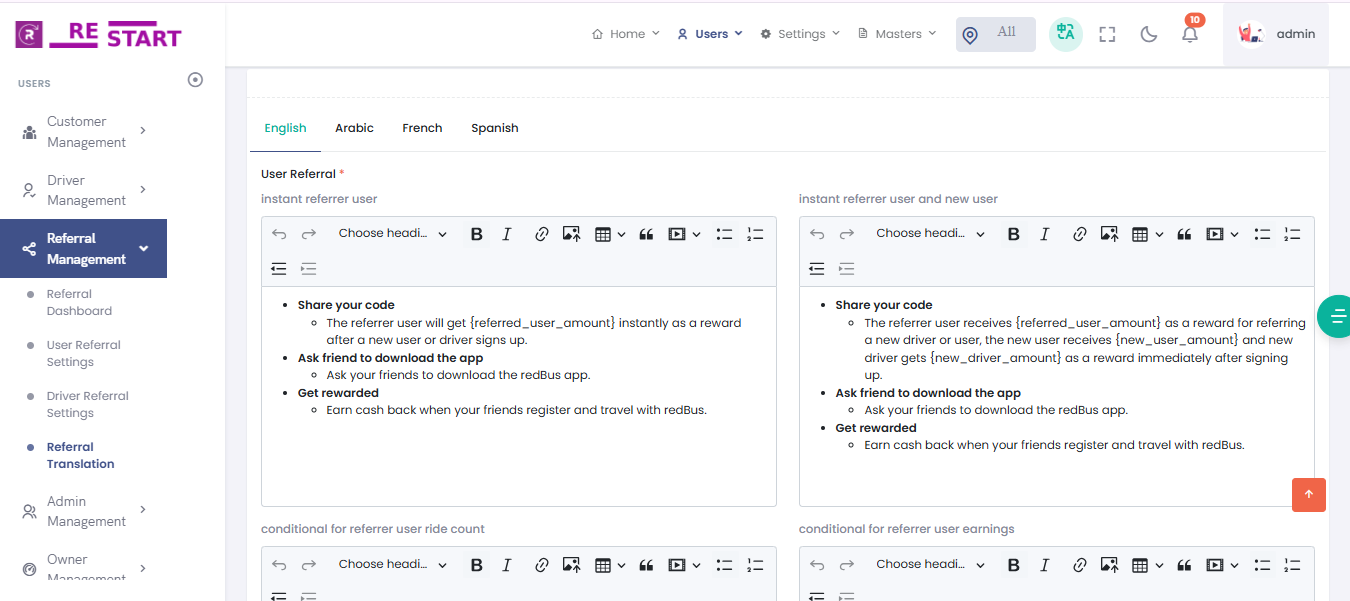 The Referral Translation Page lets you easily edit referral content for both users and drivers, based on the language shown in the mobile app.