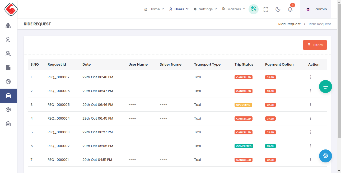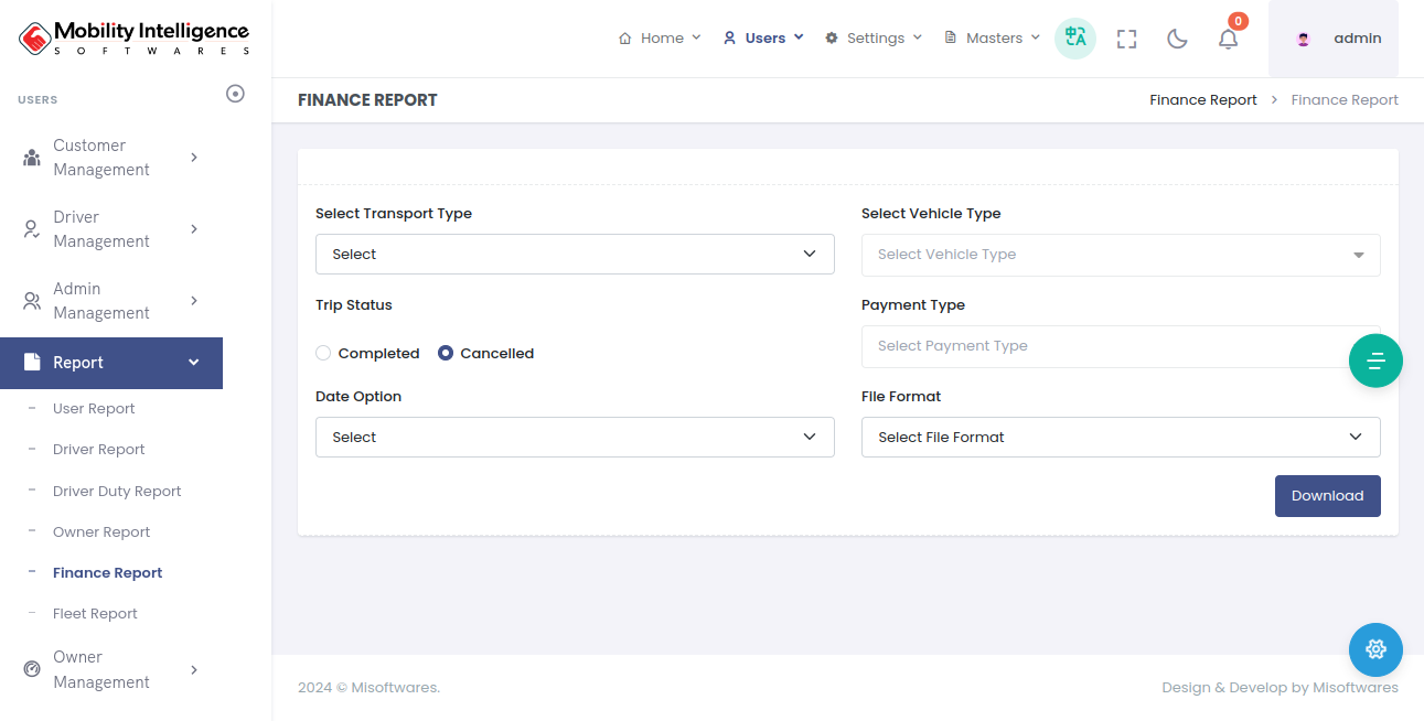 By using the reports menu admin users can download the travel,drivers & users report along with multiple filters.There you can see the different filters for each reports. Please refer an image below.