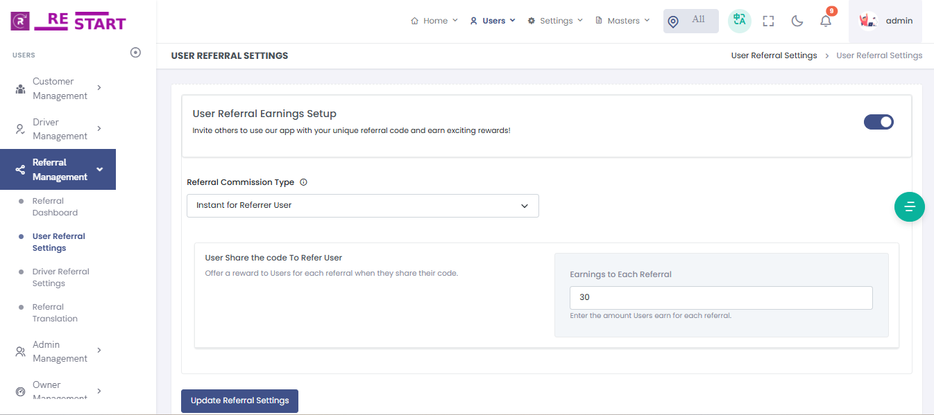 The User Referral system allows an existing user of the app to refer both new users and new drivers. When someone signs up using the referral code shared by the user, the referrer earns reward money. Depending on the referral type, the referred person may also receive a reward.